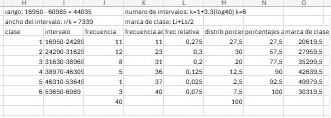 Para este ejemplo, nos basaremos en los datos de la tabla a nuestra izquierda, utilizando las fórmulas y procedimientos para trabajar con datos agrupados la variable "salario anual" (columna D)